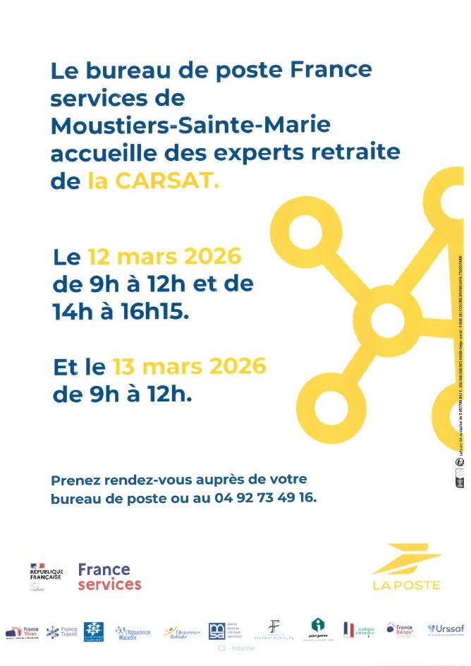 Profitez de l’occasion pour rencontrer directement des experts retraite de la CARSAT lors de leurs permanences dans le bureau de poste France services de Moustiers-Sainte-Marie !